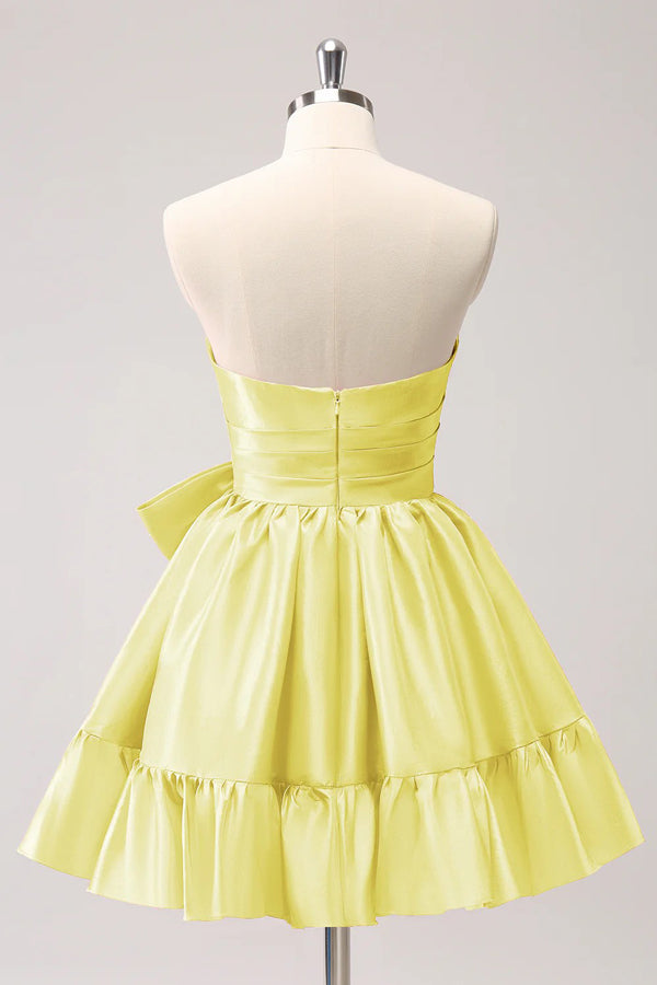 This A Line Fuchsia Strapless Ruffle Cute Homecoming Dress with Bow PD558 is the perfect combination of fun and sophistication. The lovely fuchsia color and strapless design create a cute and pretty look. while the ruffle and bow details add a touch of elegance. It's the perfect homecoming dress for any special occasion.