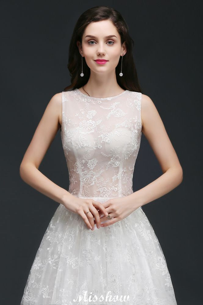 A-line Jewel Court Train Lace Simple Wedding Dresses with Buttons