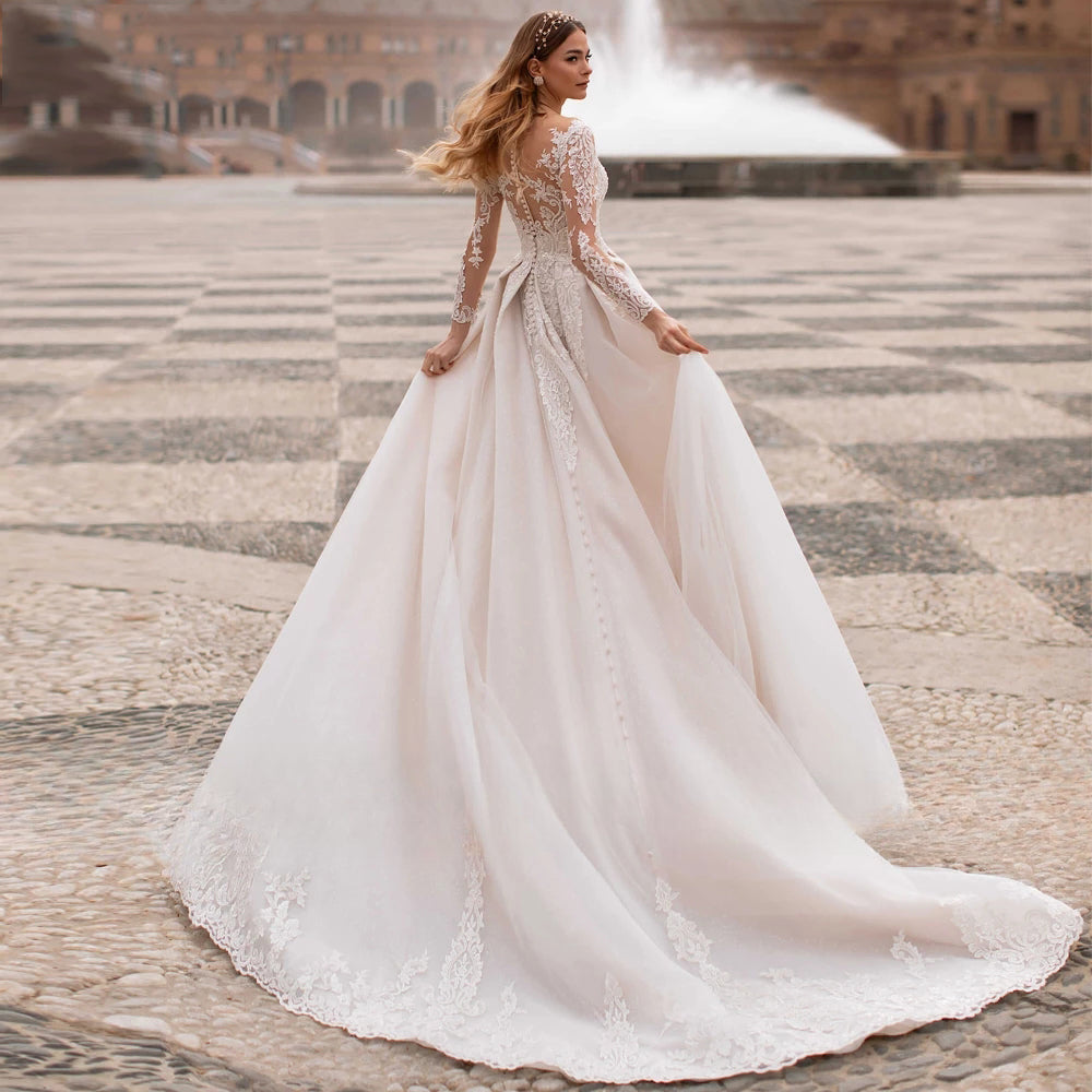 A-Line Round Neck Wedding Dress Crystal Beads Elegant Ladies Bohemian Lace Applique Long Sleeve Bride Bridal Gowns Seaside Party