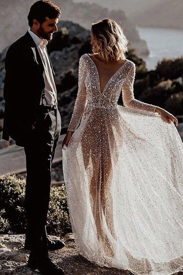 Bring elegance and sparkle to your special day with this stunning wedding dress. Featuring a see-through top adorned with long sleeves and a deep V-neckline. WD569 is perfect for the modern bride who wants to look timeless. Glittering sequins provide an eye-catching touch. making you look and feel beautiful.