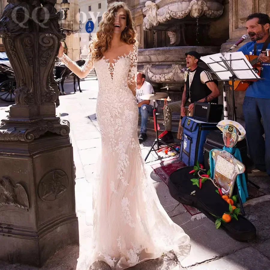 BoHo Mermaid Wedding Dress Sexy V-neck Vestidos De Novia Appliques Long Sleeves Vestido De Noiva Elegant Lace Robe De Mariée
