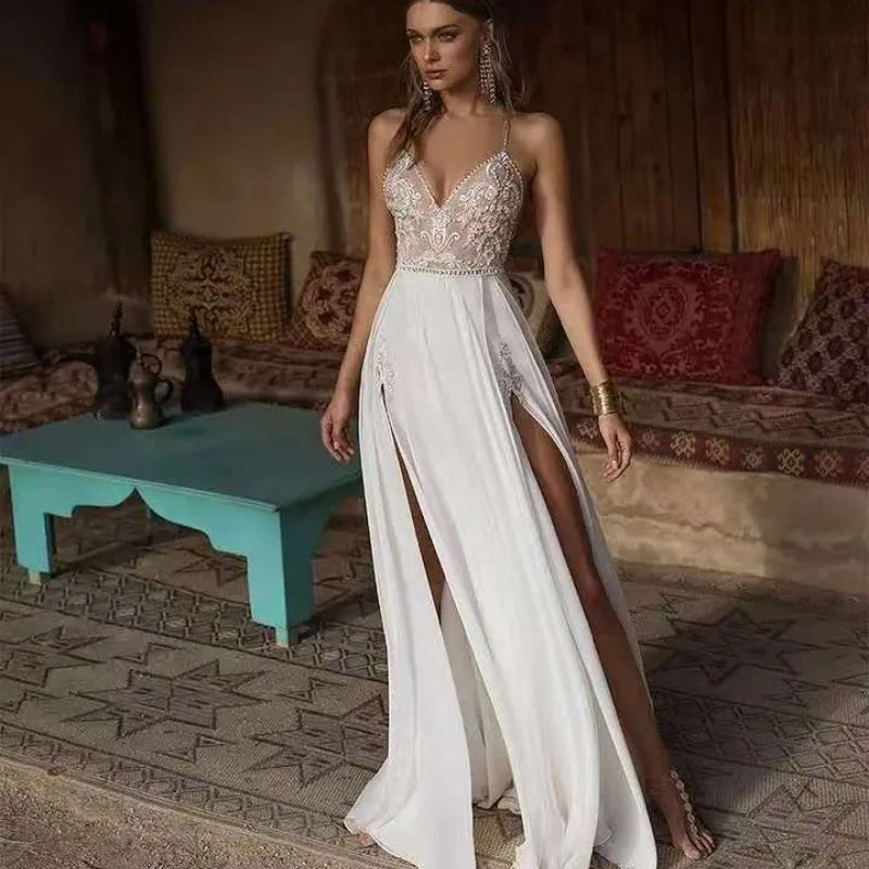 Boho Wedding Dress Sexy Slit Beach Wedding Dress V Neck Bridal Gown Spaghetti Strap Chiffon Backless Vestido De Noiva Brautkleid