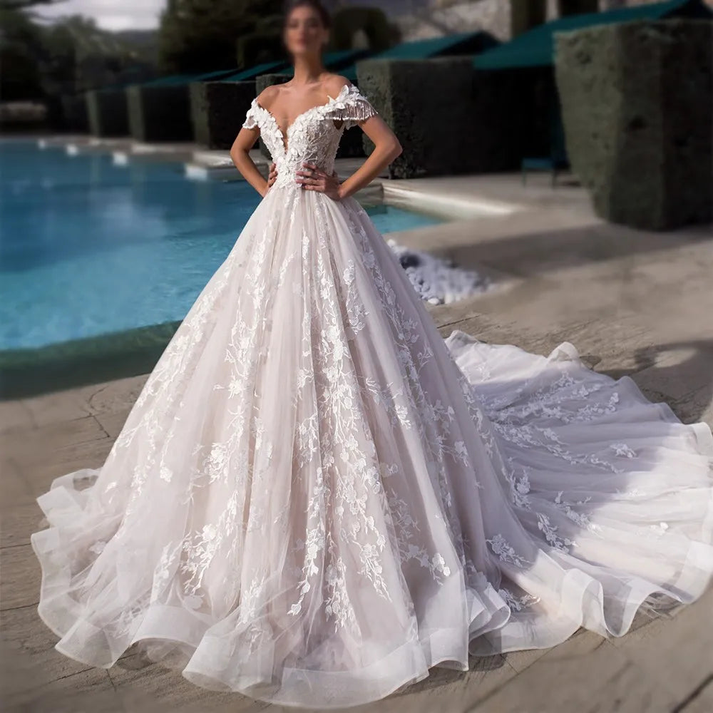 Custom Gorgeous Appliques Flowers Ball Gown Wedding Dresses Luxury Beading Boat Neck Lace Up Princess Robe De Mariée