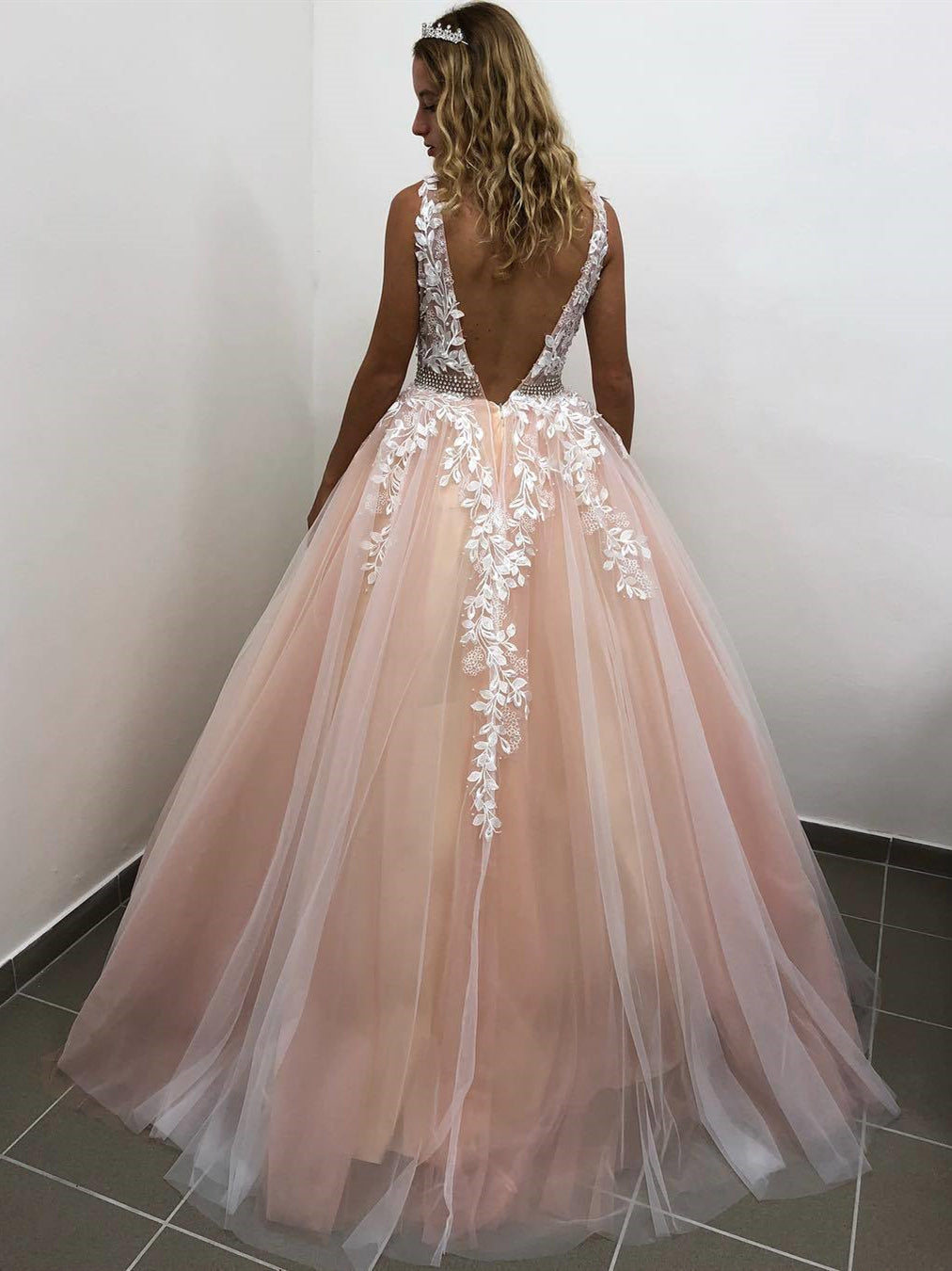 This elegant long A-line formal prom dress features a classic v-neckline. delicate tulle and lace fabric. and a stunning backless design. Perfect for any formal occasion. this dress combines timeless style with modern sophistication. Be the belle of the ball with this exquisite dress.