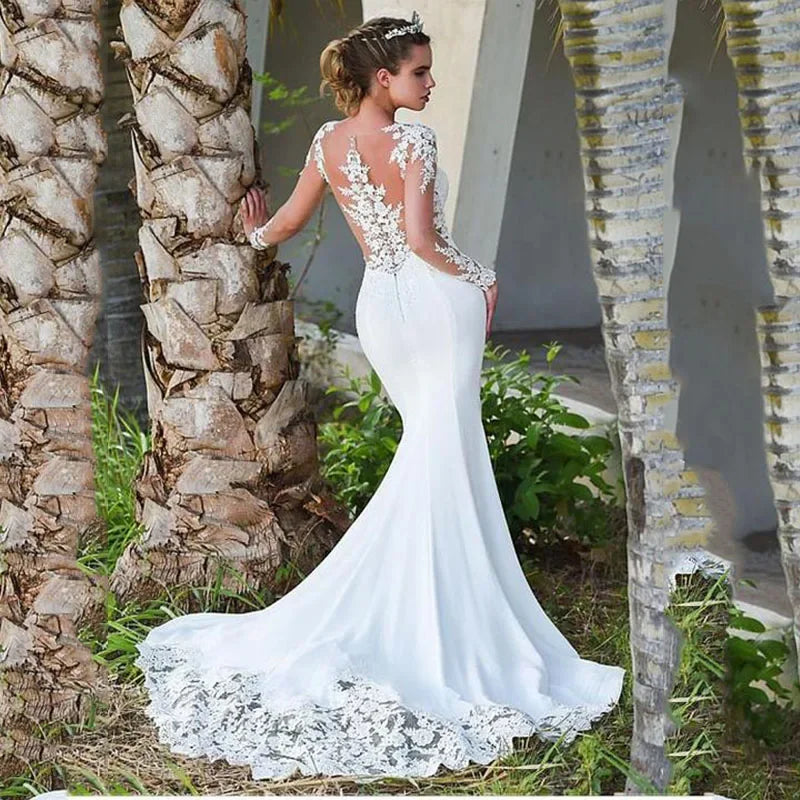 Elegant white bridal gown crew neck Long Sleeve Decal Crystal beaded floor-length long sleeve mermaid wedding dress with train