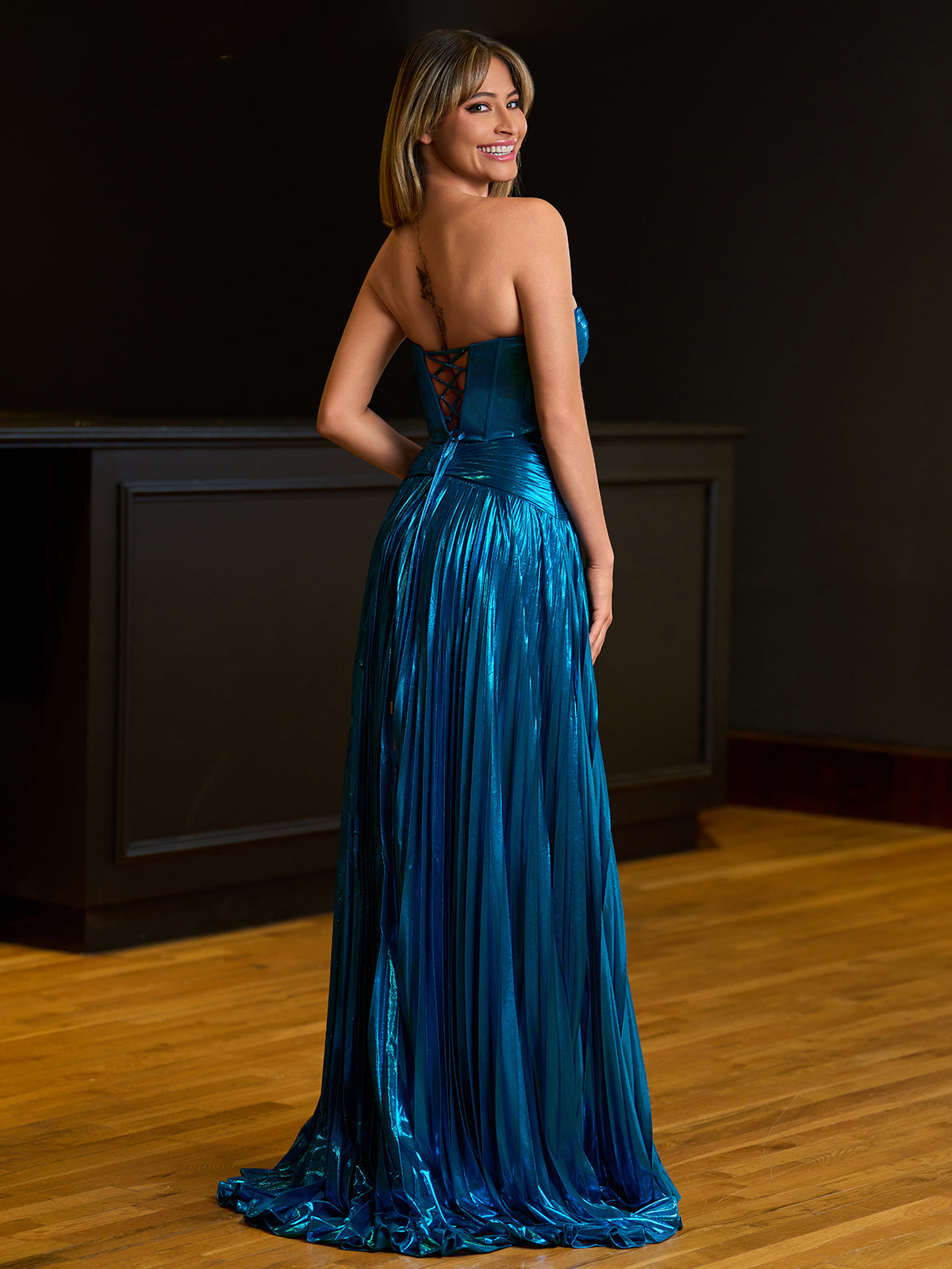 Sileas | Turquoise Sweetheart Metallic Pleated Long Formal Dress With Slit
