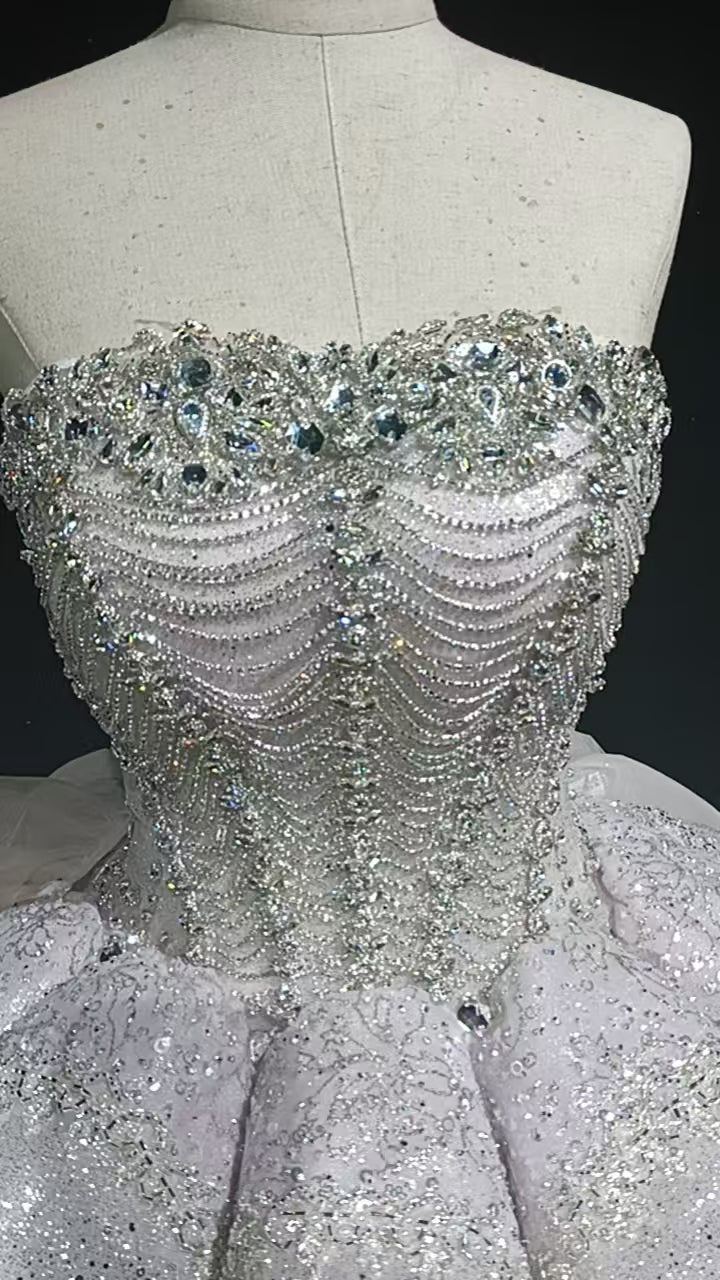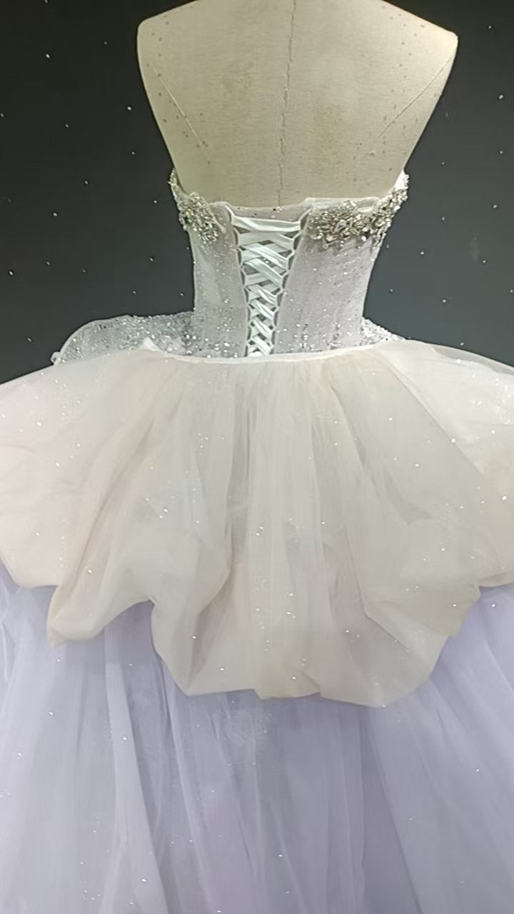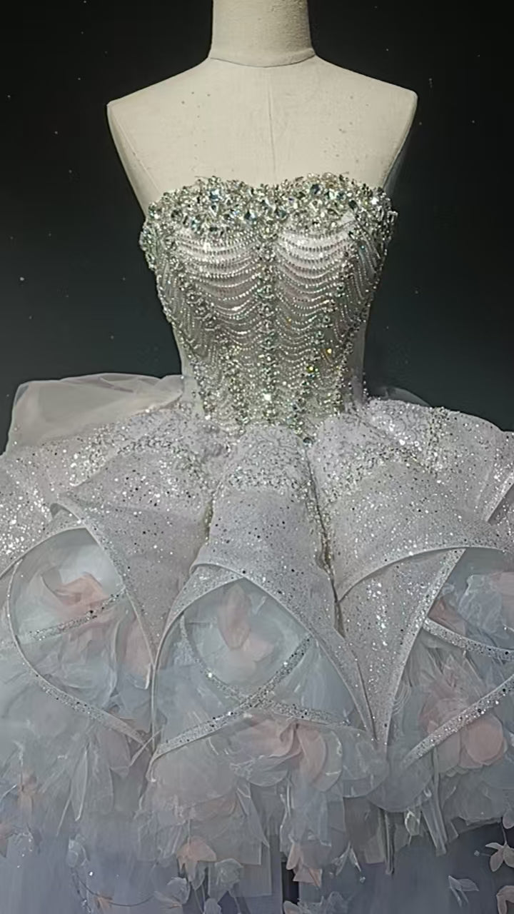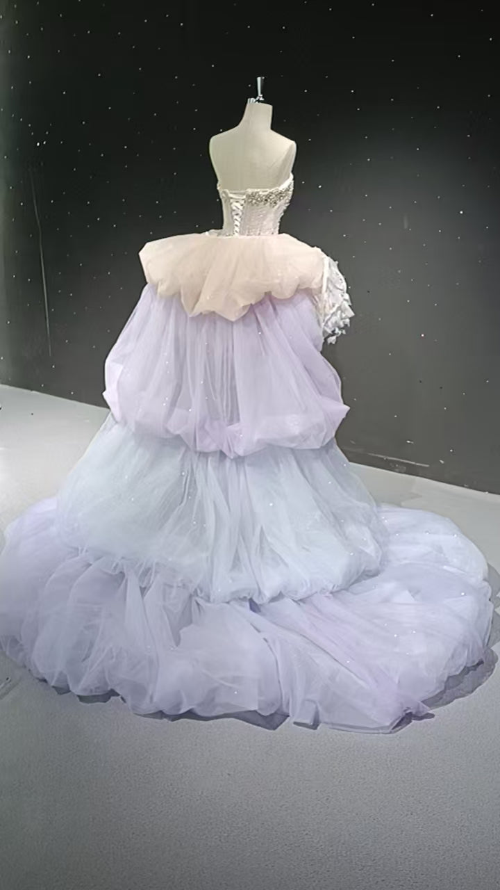 It is a dress with a luxurious and romantic style: the upper body is designed with a strapless design, covered with crystal and pearl embroidery, exquisite and sparkling; The skirt is designed in a fluffy floral bud shape, with multiple layers of gauze fabric embellished with three-dimensional floral decorations. The lower layer is also paired with a light purple gradient long trailing yarn, giving the overall princess dress a dreamy feeling and a touch of ethereal atmosphere. It is very suitable for grand occasions such as weddings and dinners.