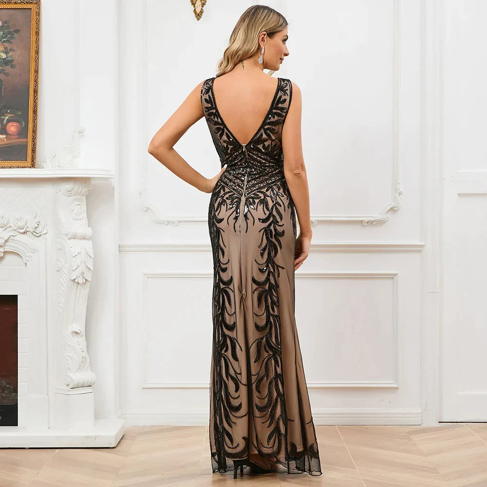 Vintage Mujer Sequins Beading Long Evening Dresses Formal Round Neck Lace Long Sexy Women Party Special Occasion